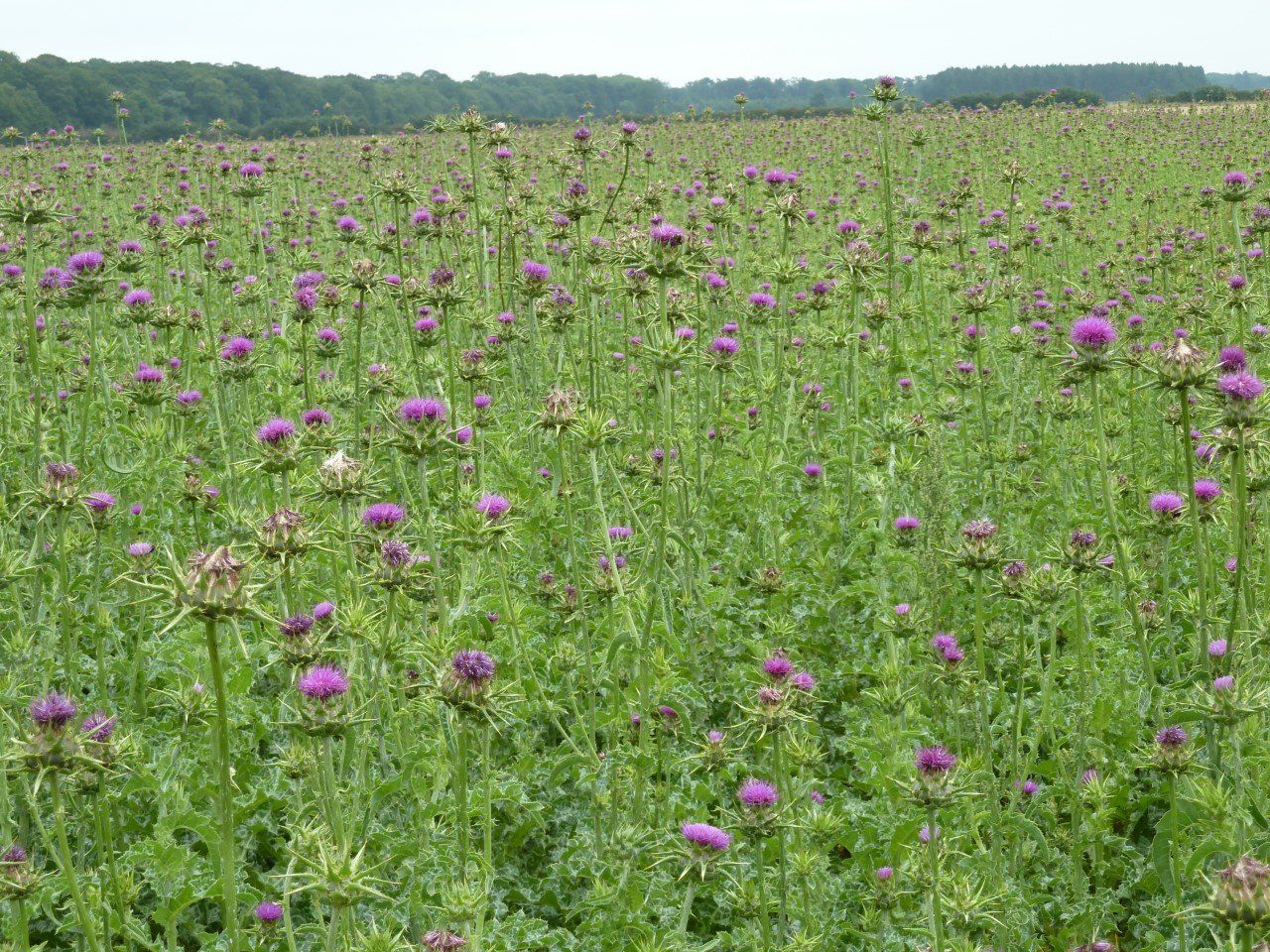(Silybum marianum (L.) Gaertner, Asteraceae) is an annual or biennial that grows from 5 - 10 feet (1.5 - 3.0 m) tall, has large prickly-edged leaves covered with undulating white patches, and stems containing a milky juice. Typically, thistle-like, large, reddish-purple flower heads with sharp spines grow at the ends of flower stalks. The fruit is small, hard, shiny, and grey to black (an achene) with a silvery pappus or fluff.